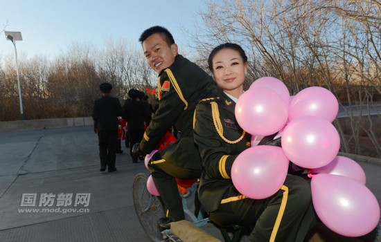 Zhang took his bride in military uniform to his bachelor dormitory with a tricycle while his comrades-in-arms beat gongs and sound drum to celebrate the wedding. Officers and soldiers gathered at their canteen and took pictures in memory of this happy moment.