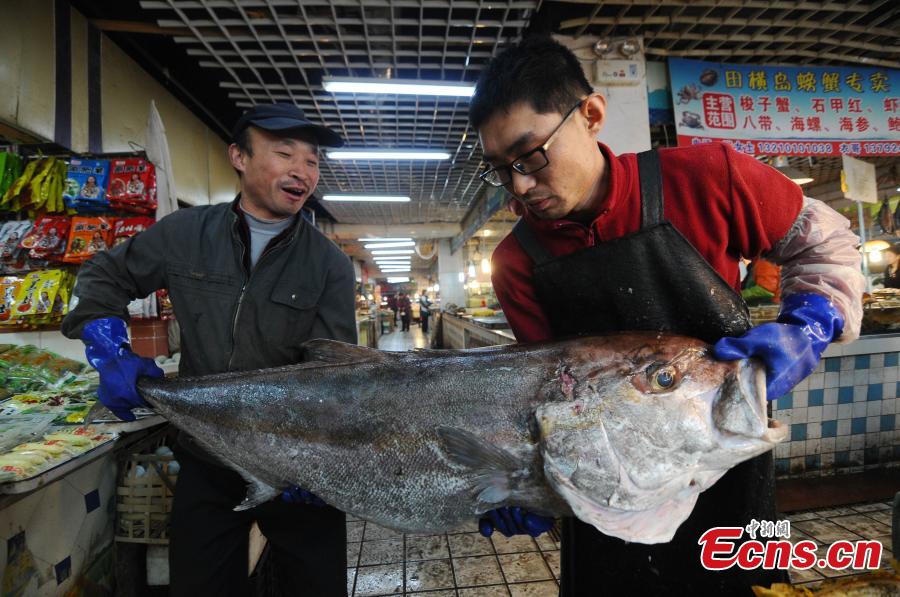 Two man carry a 1.46-meter-long, over-50-kilogram unknown fish in a food market in Qingdao, East China's Shandong province, Dec 14, 2014. Fishermen in Jiaozhou, a county-level city in Qingdao, caught this big unknown fish along with a rare 10-kilogram flatfish in Bohai Gulf on the morning of Dec 12. [Photo: China News Service/ Wang Haibin] |