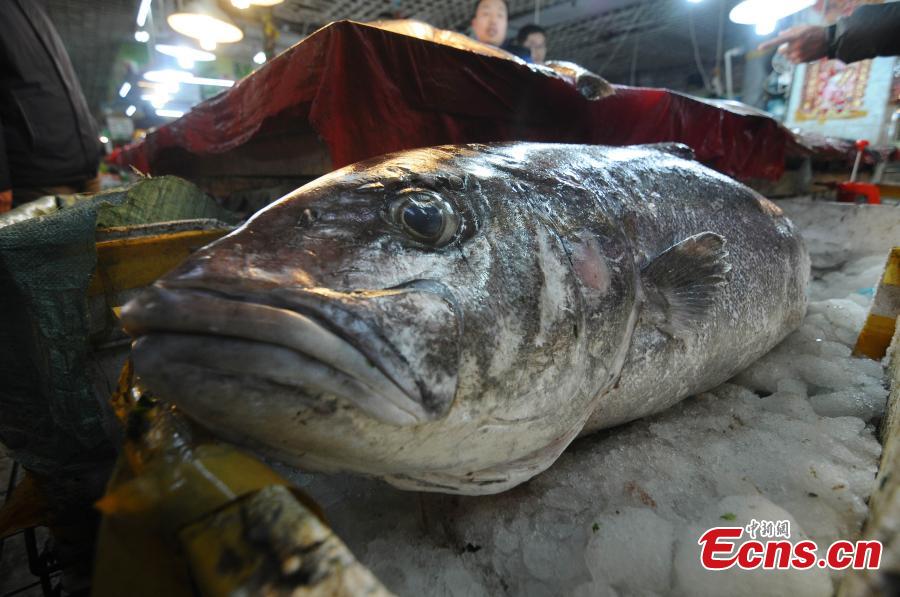 A 1.46-meter-long, over-50-kilogram unknown fish is seen placed on a stall of a market in Qingdao, East China's Shandong province, Dec 14, 2014. Fishermen in Jiaozhou, a county-level city in Qingdao, caught this big unknown fish along with a rare 10-kilogram flatfish in Bohai Gulf on the morning of Dec 12. As no one knows what it is and which price it should be sold at, this unknown fish is still unsold. [Photo: China News Service/ Wang Haibin] |