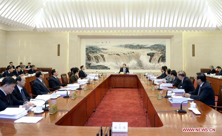 Zhang Dejiang (back), chairman of the Standing Committee of China's National People's Congress (NPC), presides over the 36th meeting of the NPC Standing Committee's chairman and vice chairpersons, at the Great Hall of the People in Beijing, capital of China, Dec. 15, 2014. (Xinhua/Zhang Duo) |