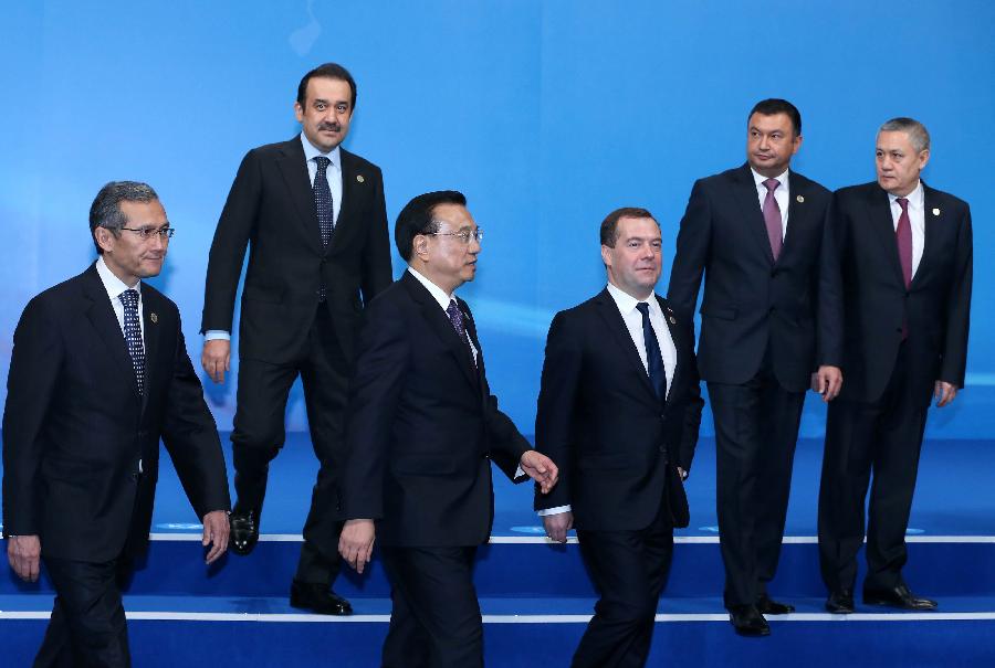 Chinese Premier Li Keqiang (3rd L) and other leaders walk to the meeting venue after they pose for a group photo during the 13th prime ministers' meeting of the Shanghai Cooperation Organization (SCO) in Astana, Kazakhstan, Dec. 15, 2014. (Xinhua/Pang Xinglei) |
