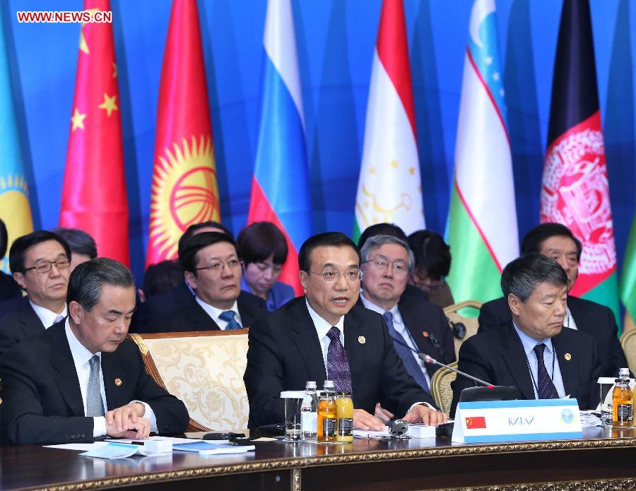 Chinese Premier Li Keqiang (C front) speaks during the 13th prime ministers' meeting of the Shanghai Cooperation Organization (SCO) in Astana, Kazakhstan, Dec. 15, 2014. (Xinhua/Pang Xinglei)