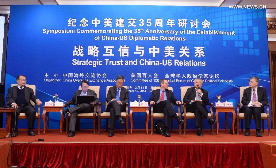 Participants speak during a discussion on Strategic Trust and China-US Relations, part of the Symposium Commemorating the 35th Anniversary of the Establishment of China-US Diplomatic Relations which is held in Beijing, capital of China, Dec. 15, 2014. (Xinhua/Chen Yehua) |