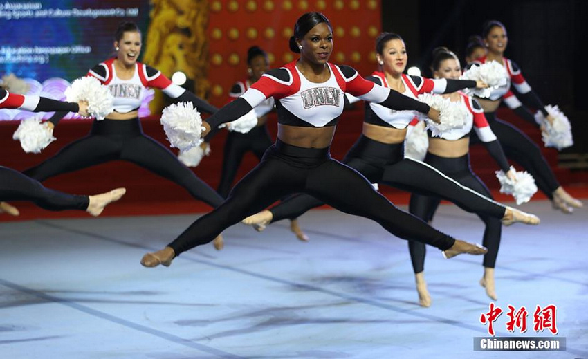 Photo taken on Dec. 14, 2014 shows college cheerleaders performing during the 2nd China Cheerleading Open Tournament at the gymnasium of Nanjing Tech University in Nanjing, east China's Jiangsu province. The competitors are 40 cheerleader teams from nine countries and regions including the US, Germany, South Korea and China. (Photo: China News Service/Yang Bo)