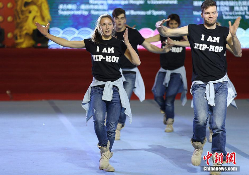 Photo taken on Dec. 14, 2014 shows college cheerleaders performing during the 2nd China Cheerleading Open Tournament at the gymnasium of Nanjing Tech University in Nanjing, east China's Jiangsu province. The competitors are 40 cheerleader teams from nine countries and regions including the US, Germany, South Korea and China. (Photo: China News Service/Yang Bo)