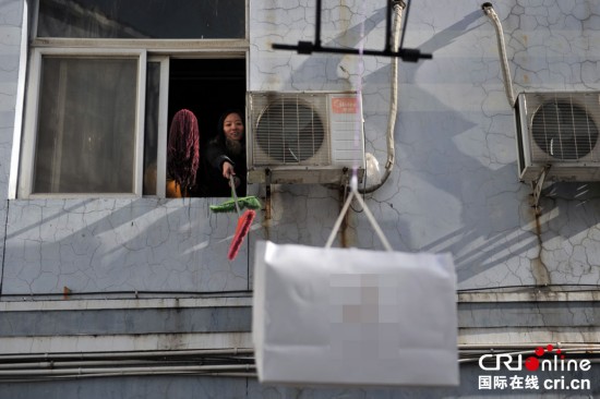 A man delivers luxury gifts with a drone to woo a girl in Langfang University Town, Hebei province on Dec 16, 2014. The girl refused the man and one of her roommates waved a broom to repel the drone. (Photo/ CRI)