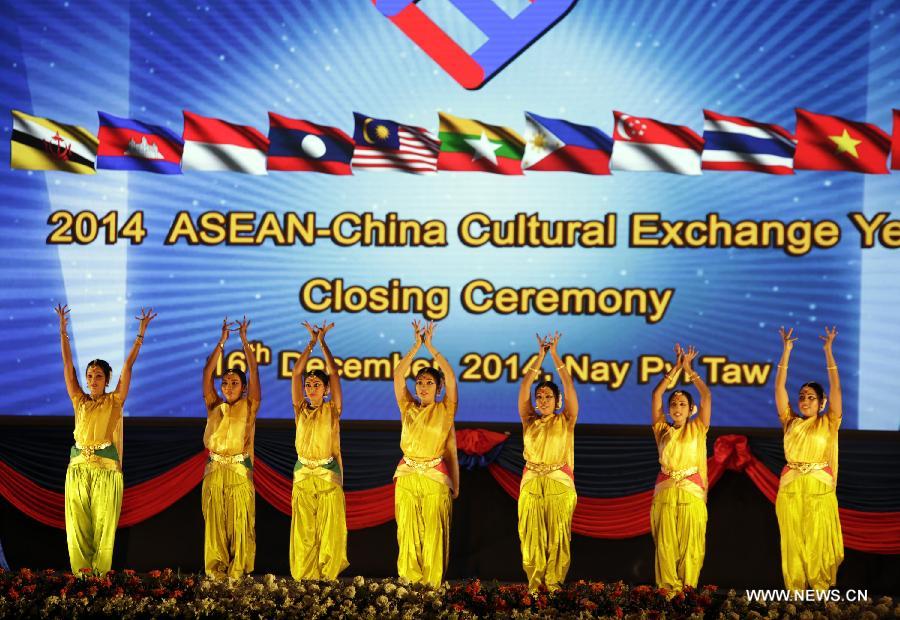 Artists from Laos perform during the China-ASEAN Cultural Exchange Year 2014 Closing Ceremony in Nay Pyi Taw, Myanmar, Dec. 16, 2014. The China-ASEAN Cultural Exchange Year 2014 ceremonially closed in Myanmar's capital of Nay Pyi Taw Tuesday night. (Xinhua/U Aung)