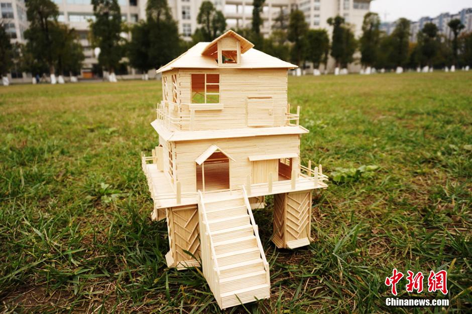 At a design contest held by SCU Jinjiang College, Wei Shuang, Zhang Yayi, and Huang Peiheng - three sophomores of the Engineering Cost major - designed and built a delicate villa with 4,000 sticks, which became the most popular piece of work at the contest.