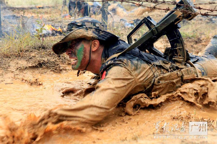 A soldier crawls in a mud pit topped with barbed wire.(Photo/GZ.81.CN)
