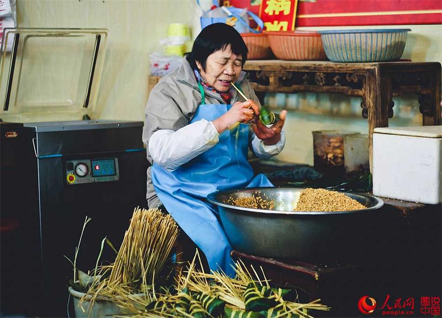 An old woman makes zongzi, made of glutinous rice stuffed with streaky pork. (Photo/people.cn)