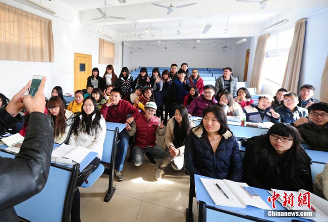 Meng Xiangbin, a photojournalism teacher, takes a group photo of students before and after a class to keep track of attendance at Wuhan Media and Communications College, Huazhong Normal University in Wuhan city, Hubei province on Dec 16, 2014. This new way of calling the roll not only intrigues students’ passion for photography but also reduces the frequency of them arriving late or leaving early, according to Meng. (Photo/ CNS) |