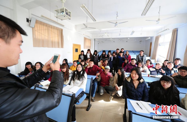 Meng Xiangbin, a photojournalism teacher, takes a group photo of students before and after a class to keep track of attendance at Wuhan Media and Communications College, Huazhong Normal University in Wuhan city, Hubei province on Dec 16, 2014. This new way of calling the roll not only intrigues students’ passion for photography but also reduces the frequency of them arriving late or leaving early, according to Meng. (Photo/ CNS) |