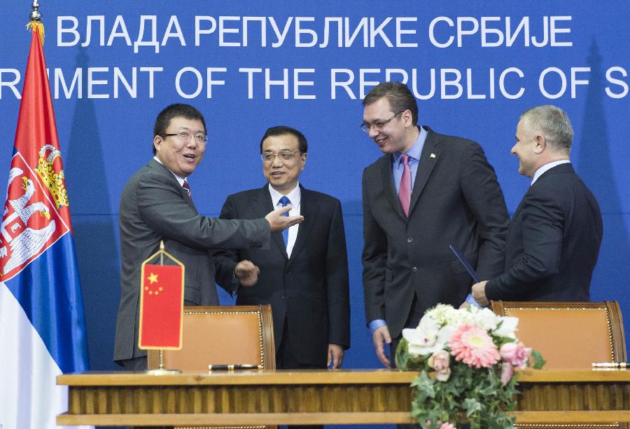 Chinese Premier Li Keqiang (2nd L) and Serbian Prime Minister Aleksandar Vucic (2nd R) attend a signing ceremony after their talks in Belgrade, Serbia, Dec. 17, 2014. (Xinhua/Huang Jingwen)