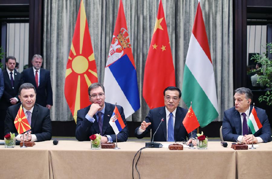 Chinese Premier Li Keqiang (2nd R), Serbian Prime Minister Aleksandar Vucic (2nd L), Hungarian Prime Minister Viktor Orban (R) and Macedonian Prime Minister Nikola Gruevski meet journalists after their meeting in Belgrade, Serbia, Dec. 17, 2014. (Xinhua/Yao Dawei) |