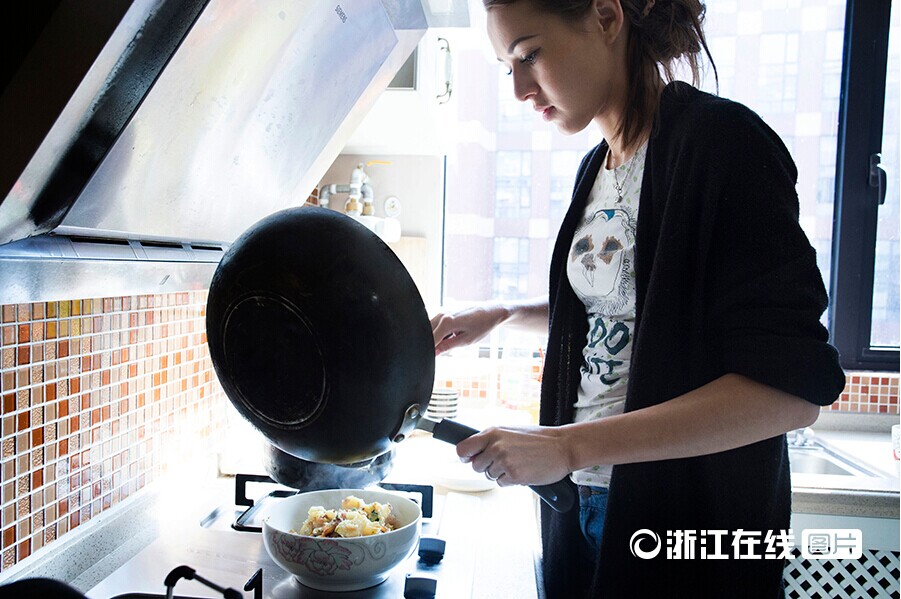 Diana makes breakfast for herself. (Zhejiang Online/Tong Xiaolei)