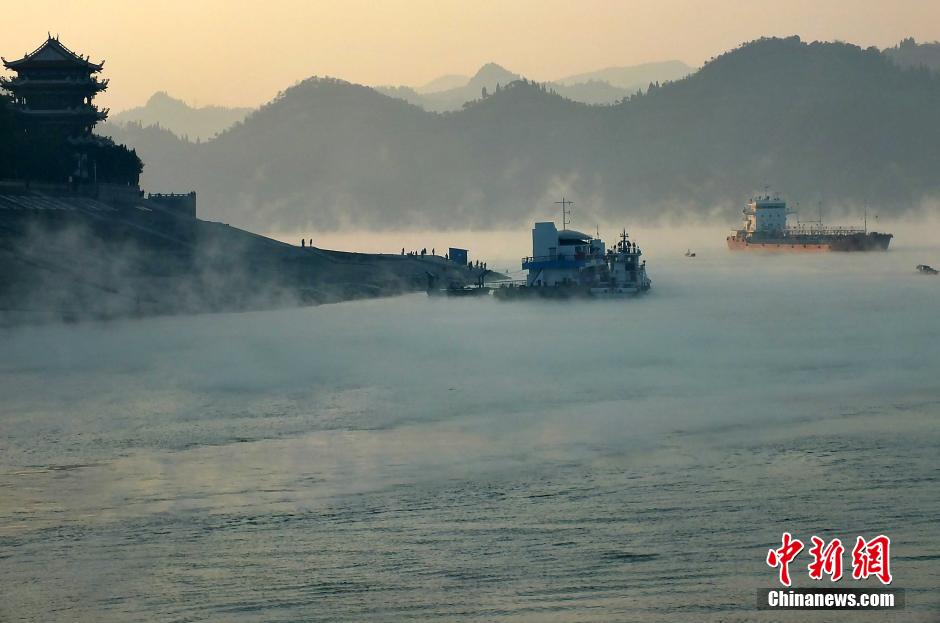 Mist shrouds the Yangtze River in the morning of Dec. 17 in Yichang city, central China's Hubei province. According to meteorological experts, the phenomenon occurred due to the sudden drop of temperature recently which resulted in the water temperature being higher than the air temperature. (CNS/Liu Junfeng)