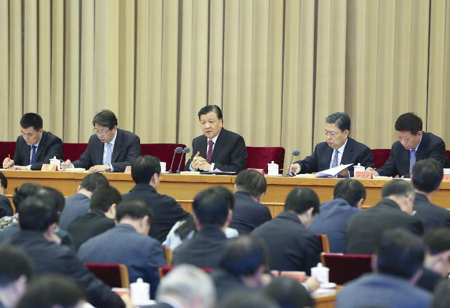 Liu Yunshan (C), a member of the Standing Committee of the Political Bureau of the Communist Party of China (CPC) Central Committee, who is also a member of the Secretariat of the CPC Central Committee, speaks during a meeting of organization department heads of CPC Committees at all levels in Beijing, capital of China, Dec. 19, 2014. (Xinhua/Ding Lin) |