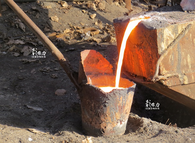 Workers spoon molten iron and cast it in the mold. (iqilu.com/Tian Ran)