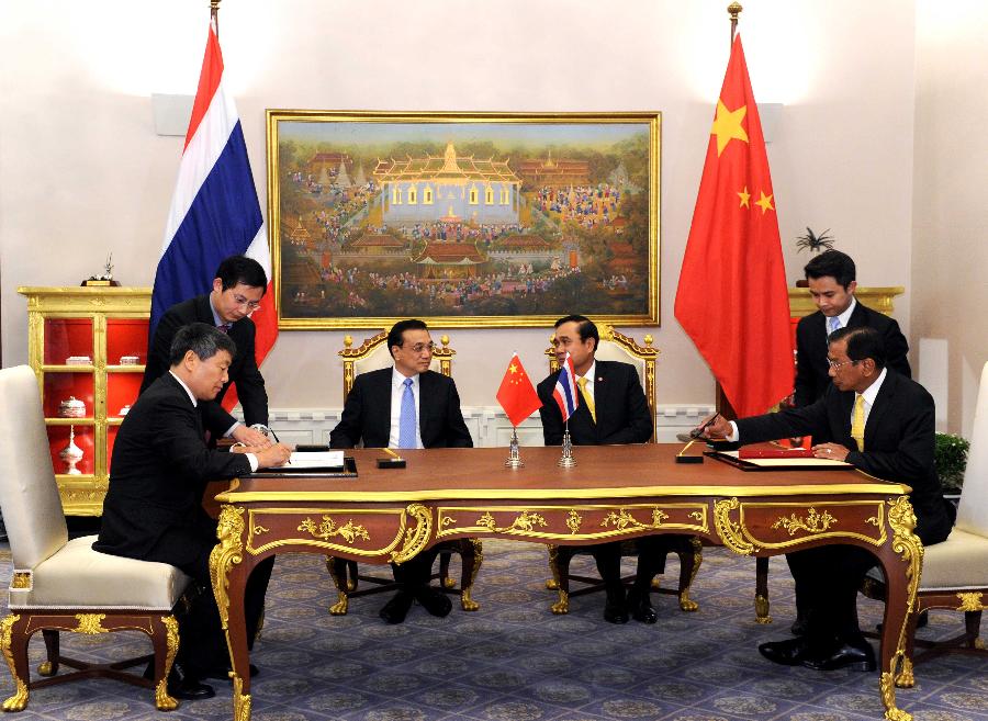 Chinese Premier Li Keqiang (center L) and Thai Prime Minister Prayuth Chan-ocha (center R) attend the signing ceremony of two memoranda of understanding on railway cooperation and farm produce trade cooperation respectively after they met in Bangkok, Thailand, Dec. 19, 2014. (Xinhua/Rao Aimin)