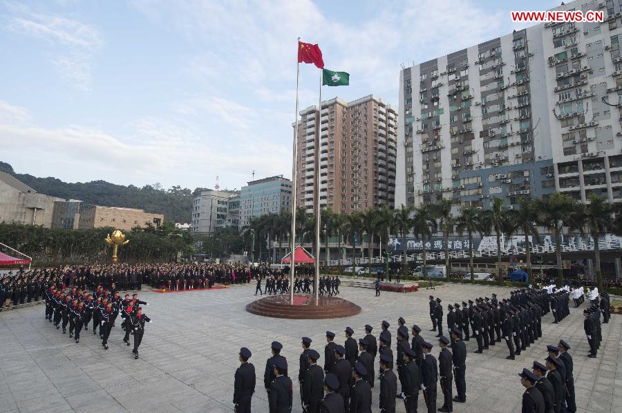 A flag-raising ceremony is held to celebrate the 15th anniversary of Macao's return to the motherland in Macao, south China, Dec. 20, 2014. (Xinhua/Lui Siu Wai)