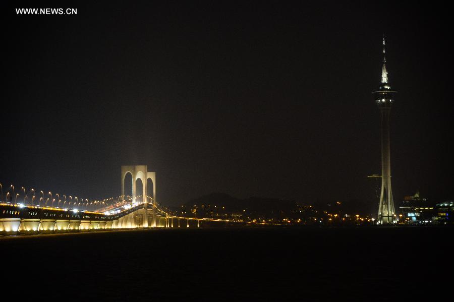 This photo taken on late Dec. 19, 2014 shows the illuminated cityscape of south China's Macao. Macao will mark the 15th anniversary of its return to China on Dec. 20. (Xinhua/Cheong Kam Ka)