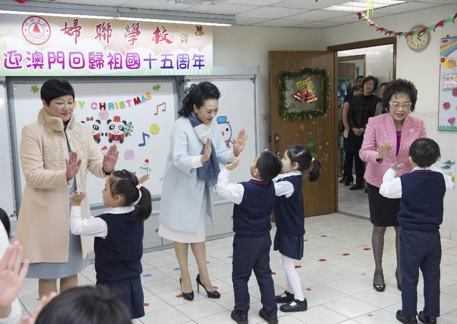 Peng Liyuan (C), wife of Chinese President Xi Jinping, high-fives with two children as they listen to a folk rhyme during her visit to a kindergarten under the Women's General Association of Macao with the company of Fok Wai Fun (L), wife of Macao's Chief Executive Chui Sai On, in south China's Macao, Dec. 19, 2014. (Xinhua/Wang Ye) |