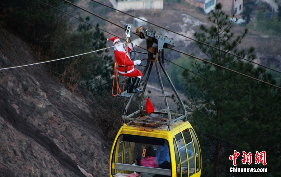 One member of the scenic spot staff, dressed like Santa Claus, climbs the cable car to send gift to visitors for celebrating the up-coming Christmas in China's Hunan Province. (Photo source:chinanews.com)