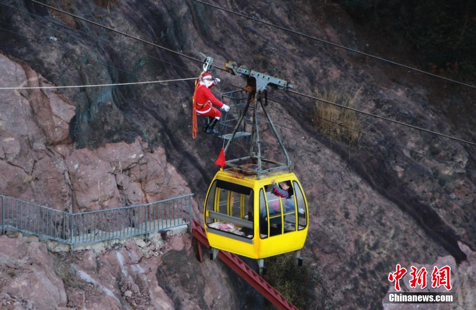 One member of the scenic spot staff, dressed like Santa Claus, climbs the cable car to send gift to visitors for celebrating the up-coming Christmas in China's Hunan Province. (Photo source:chinanews.com)