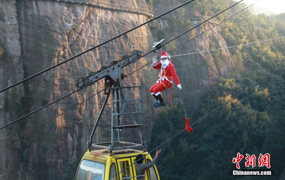 One member of the scenic spot staff, dressed like Santa Claus, climbs the cable car to send gift to visitors for celebrating the up-coming Christmas in China's Hunan Province. (Photo source:chinanews.com)