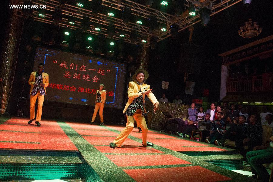 A Zimbabwean dance group performs at a Christmas party in Harare, Zimbabwe, Dec. 22, 2014. The Chinese Federation of Zimbabwe on Monday organized a Christmas party themed "We are together" in western suburbs of Harare to bring Zimbabweans and Chinese together in celebrating the Christmas holiday that begins this week. (Xinhua/Xu Lingui) |