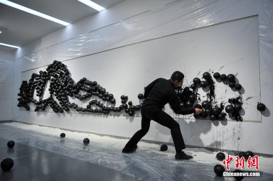 Naxi artists He Libin uses a whip to break the balloons filled with ink hanging on the canvas to complete his artwork "Autumn Scene at the riverside of Fuchun River" at an exhibition in Kunming, southwest China's Yunnan province on Dec. 20, 2014, which has attracted people's attention. (CNS/Ren Dong)