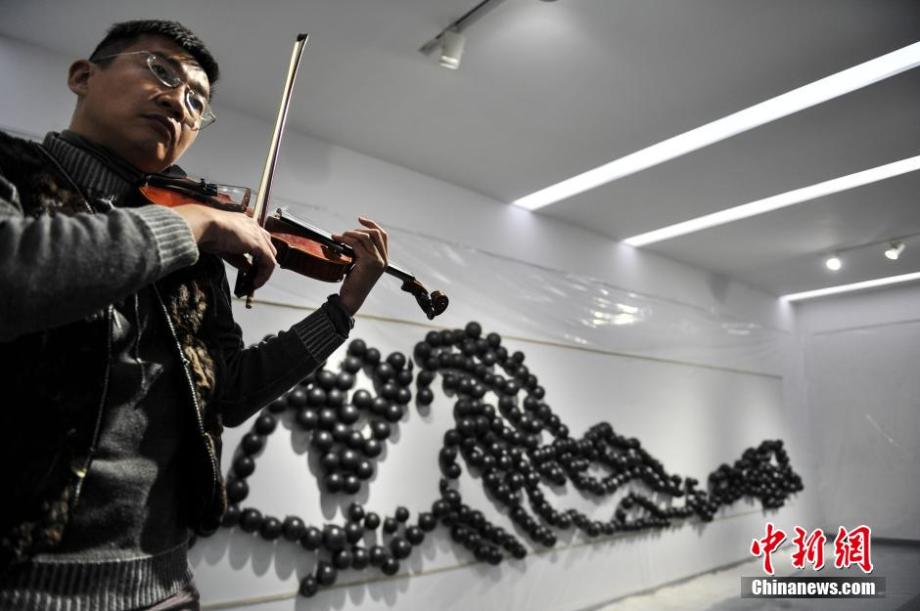 Naxi artists He Libin uses a whip to break the balloons filled with ink hanging on the canvas to complete his artwork "Autumn Scene at the riverside of Fuchun River" at an exhibition in Kunming, southwest China's Yunnan province on Dec. 20, 2014, which has attracted people's attention. (CNS/Ren Dong)