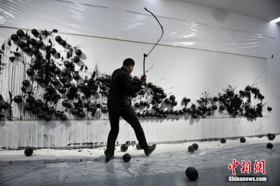 Naxi artists He Libin uses a whip to break the balloons filled with ink hanging on the canvas to complete his artwork "Autumn Scene at the riverside of Fuchun River" at an exhibition in Kunming, southwest China's Yunnan province on Dec. 20, 2014, which has attracted people's attention. (CNS/Ren Dong)