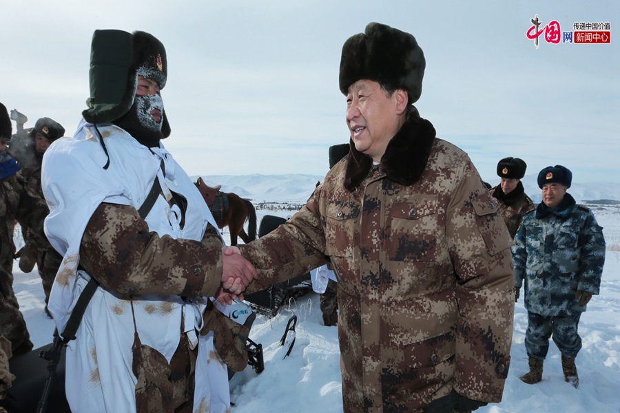 On Jan. 26, 2014, President Xi Jinping visits the soldiers in Arxan Mountain, north China's Inner Mongolia autonomous region. Looking at the hard working soldiers on duty in severe cold at minus 30 degrees Celsius, Xi, on behalf of Chinese people, extended gratefulness to them. (Photo/China.com.cn)