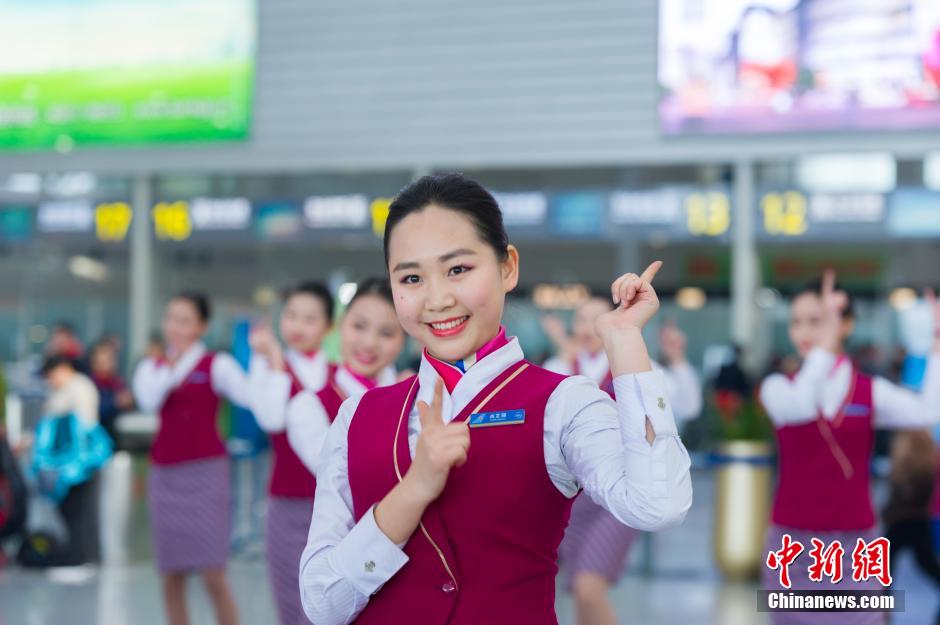 26 flight attendants perform flash mob in Longdongbao Airport Terminal in Guiyang, capital of southwest China's Guizhou province to welcome the upcoming new year on Dec. 22, 2014. (CNS/He Junyi)