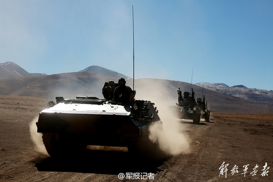 A battalion successfully conducted a tactical drill at the foot of Mount Tanggula in Tibet on Dec. 20, 2014. It’s a great challenge for soldiers to complete missions in the severe cold of a 5000-meter-high plateau. (Official microblog of PLA Daily)