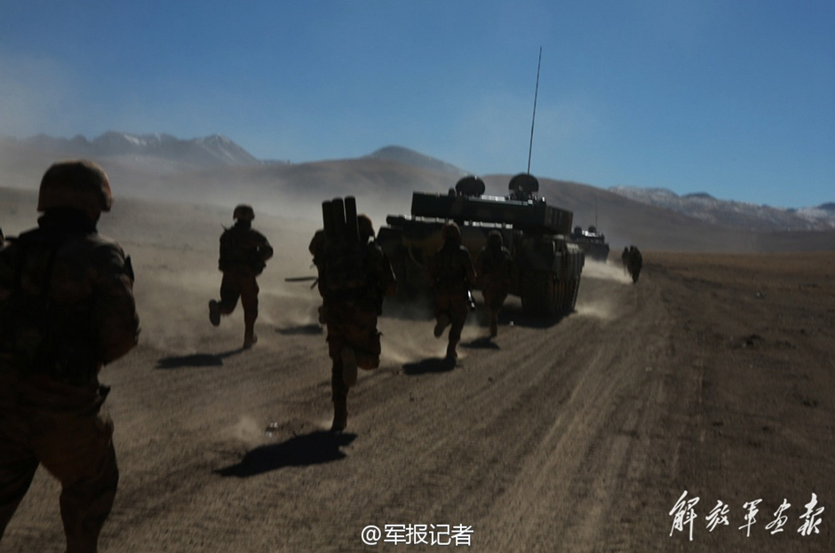 A battalion successfully conducted a tactical drill at the foot of Mount Tanggula in Tibet on Dec. 20, 2014. It’s a great challenge for soldiers to complete missions in the severe cold of a 5000-meter-high plateau. (Official microblog of PLA Daily)