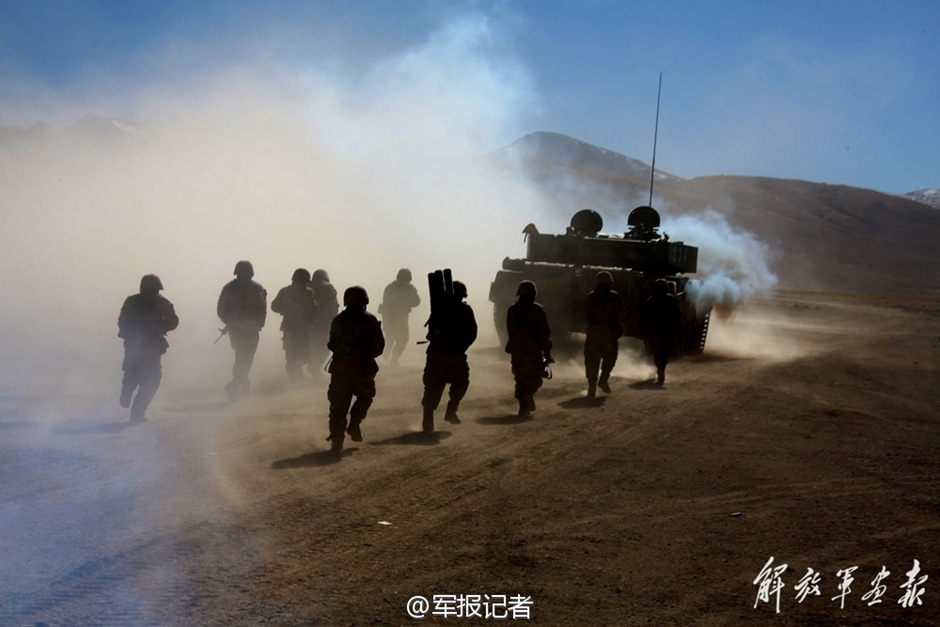 A battalion successfully conducted a tactical drill at the foot of Mount Tanggula in Tibet on Dec. 20, 2014. It’s a great challenge for soldiers to complete missions in the severe cold of a 5000-meter-high plateau. (Official microblog of PLA Daily)