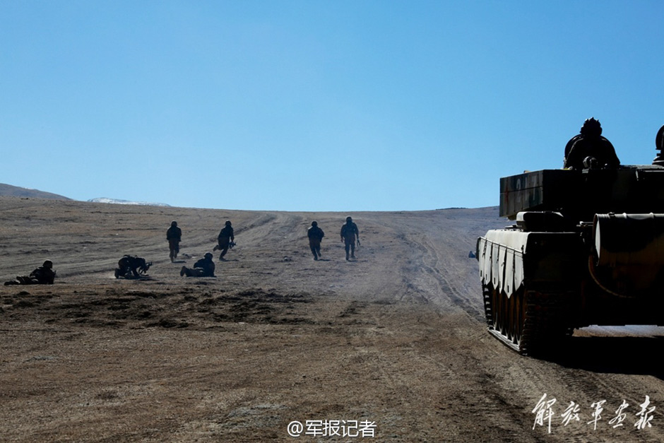 A battalion successfully conducted a tactical drill at the foot of Mount Tanggula in Tibet on Dec. 20, 2014. It’s a great challenge for soldiers to complete missions in the severe cold of a 5000-meter-high plateau. (Official microblog of PLA Daily) |