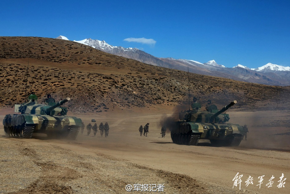 A battalion successfully conducted a tactical drill at the foot of Mount Tanggula in Tibet on Dec. 20, 2014. It’s a great challenge for soldiers to complete missions in the severe cold of a 5000-meter-high plateau. (Official microblog of PLA Daily)