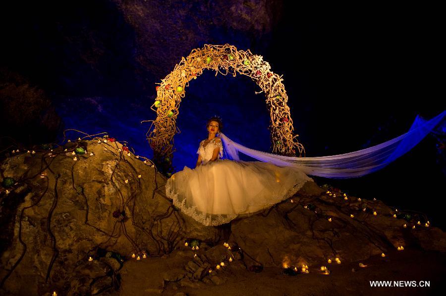 A bride shows on her wedding ceremony at a karst cave in Chongqing, southwest China, Dec. 24, 2014. (Xinhua/Liu Chan)