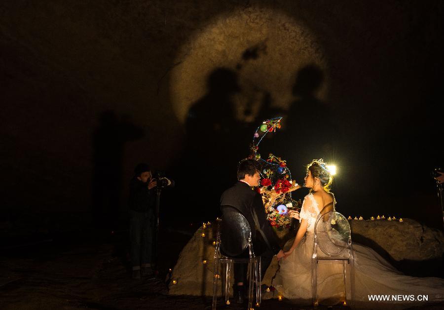 A couple have lunch during their wedding ceremony at a karst cave in Chongqing, southwest China, Dec. 24, 2014. (Xinhua/Liu Chan)