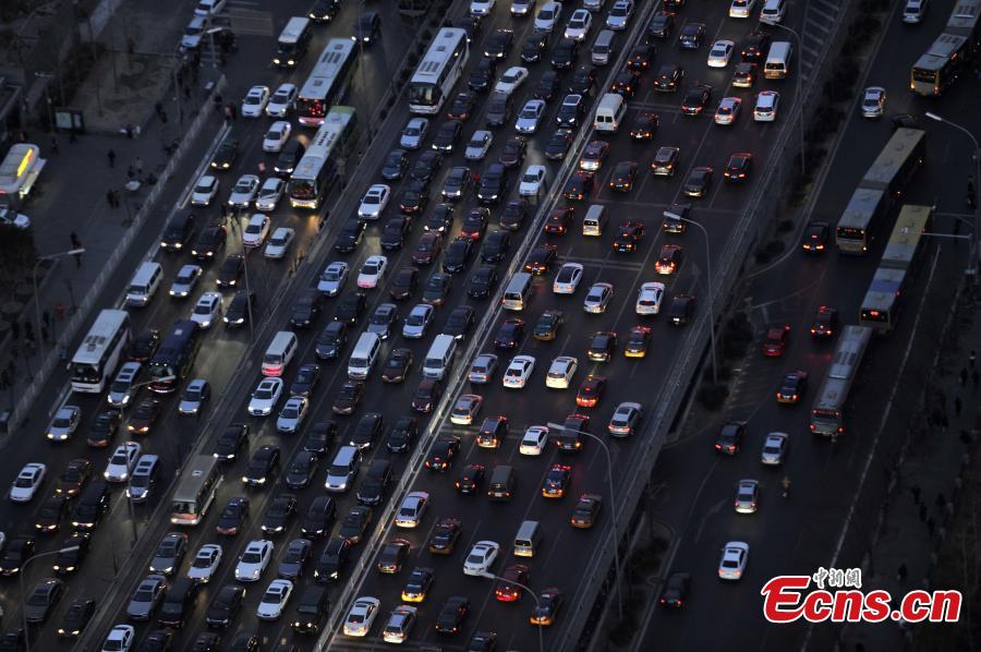 A traffic jam is pictured on roads at the 2nd Ring Road in Beijing, capital of China, Dec. 24, 2014. As Christmas Day draws near, congestion in the capital is expected to reach a peak. (China News Service/Wei Xi)
