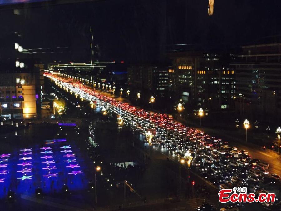 Lines of cars are pictured during a rush hour traffic jam along Chang'an Avenue of Beijing, capital of China on December 24, 2014. As Christmas Day draws near, congestion in the capital is expected to reach a peak this week. (China News Service/Wei Xi) |