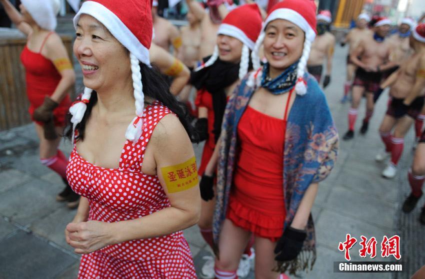 Citizens, braving the cold, participate in a swimsuit run in Changchun, northeast China's Jilin province on Dec. 24, 2014, to celebrate Christmas. (CNS/Zhang Yao)