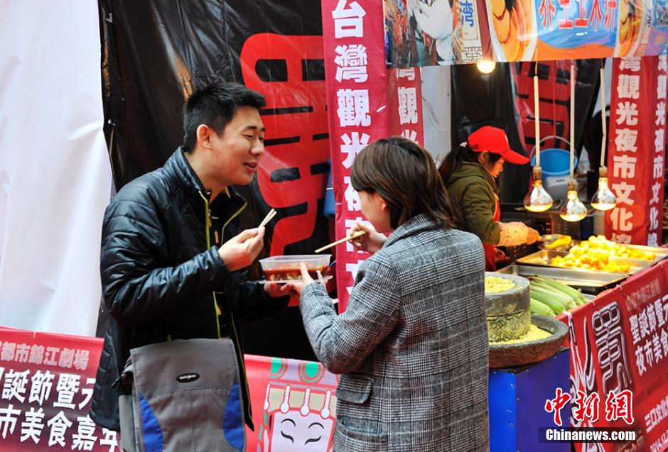 Three famous night markets in Taiwan - Shilin, Fengjia, and Liuhe - come to Chengdu Dec. 24, 2014. In addition to delicious food, the Electric Techno Neon Gods, a subcultural performance which combines traditional Taiwan folk performance with modern pop music, and face-changing of Sichuan Opera can also be found at the food carnival. (Chinanews/An Yuan)