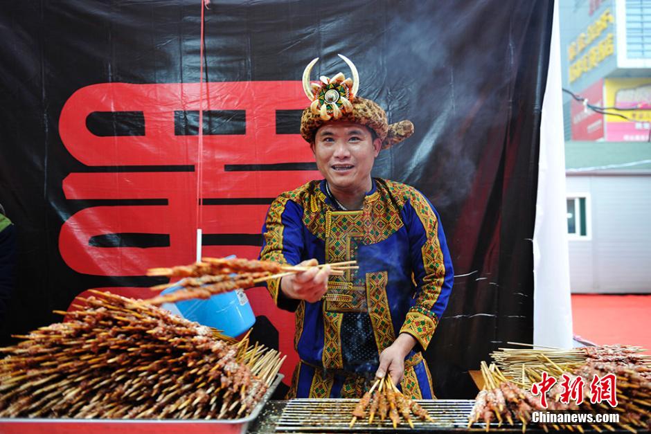 Three famous night markets in Taiwan - Shilin, Fengjia, and Liuhe - come to Chengdu Dec. 24, 2014. In addition to delicious food, the Electric Techno Neon Gods, a subcultural performance which combines traditional Taiwan folk performance with modern pop music, and face-changing of Sichuan Opera can also be found at the food carnival. (Chinanews/An Yuan)