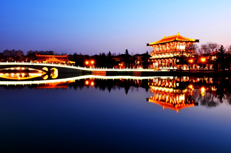 Tang Paradise, located in the east side of Big Wild Goose Pagoda in Xi'an, is the first large-scale theme park of imperial garden of Tang Dynasty. Touring the place at night gives visitors a feel of mystery.