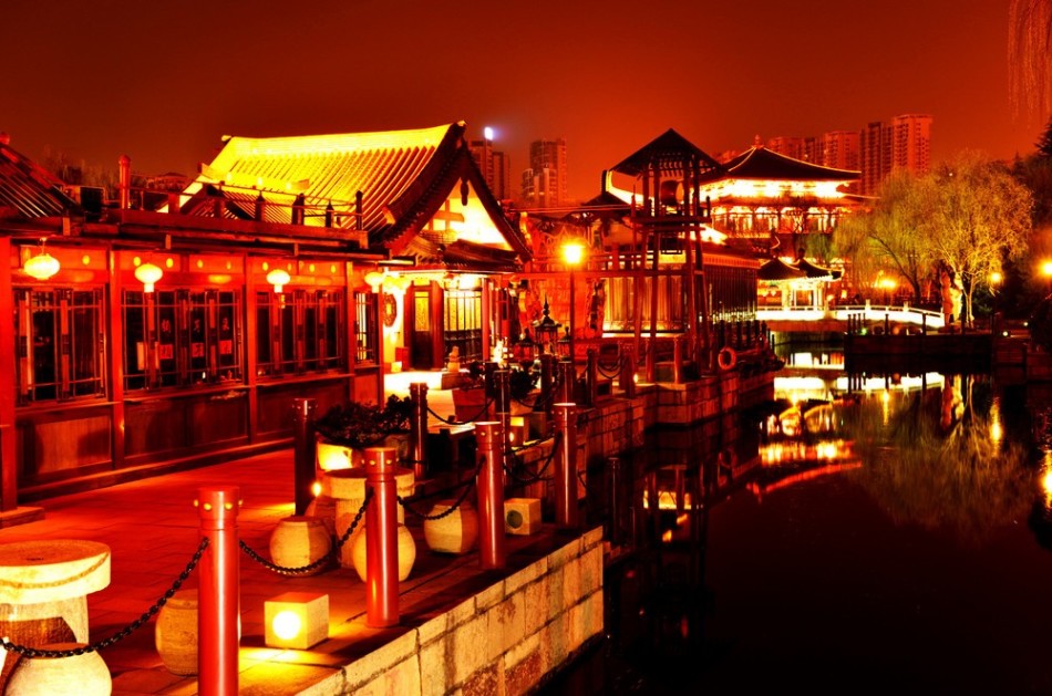 Tang Paradise, located in the east side of Big Wild Goose Pagoda in Xi'an, is the first large-scale theme park of imperial garden of Tang Dynasty. Touring the place at night gives visitors a feel of mystery.