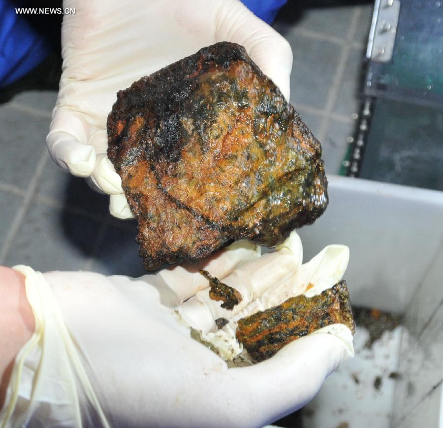 A member of a Chinese scientific research team studies a sulfide sample collected by Jiaolong, China's first manned deep-sea submersible, in the southwest Indian Ocean, Dec. 26, 2014. (Xinhua/Zhang Xudong)